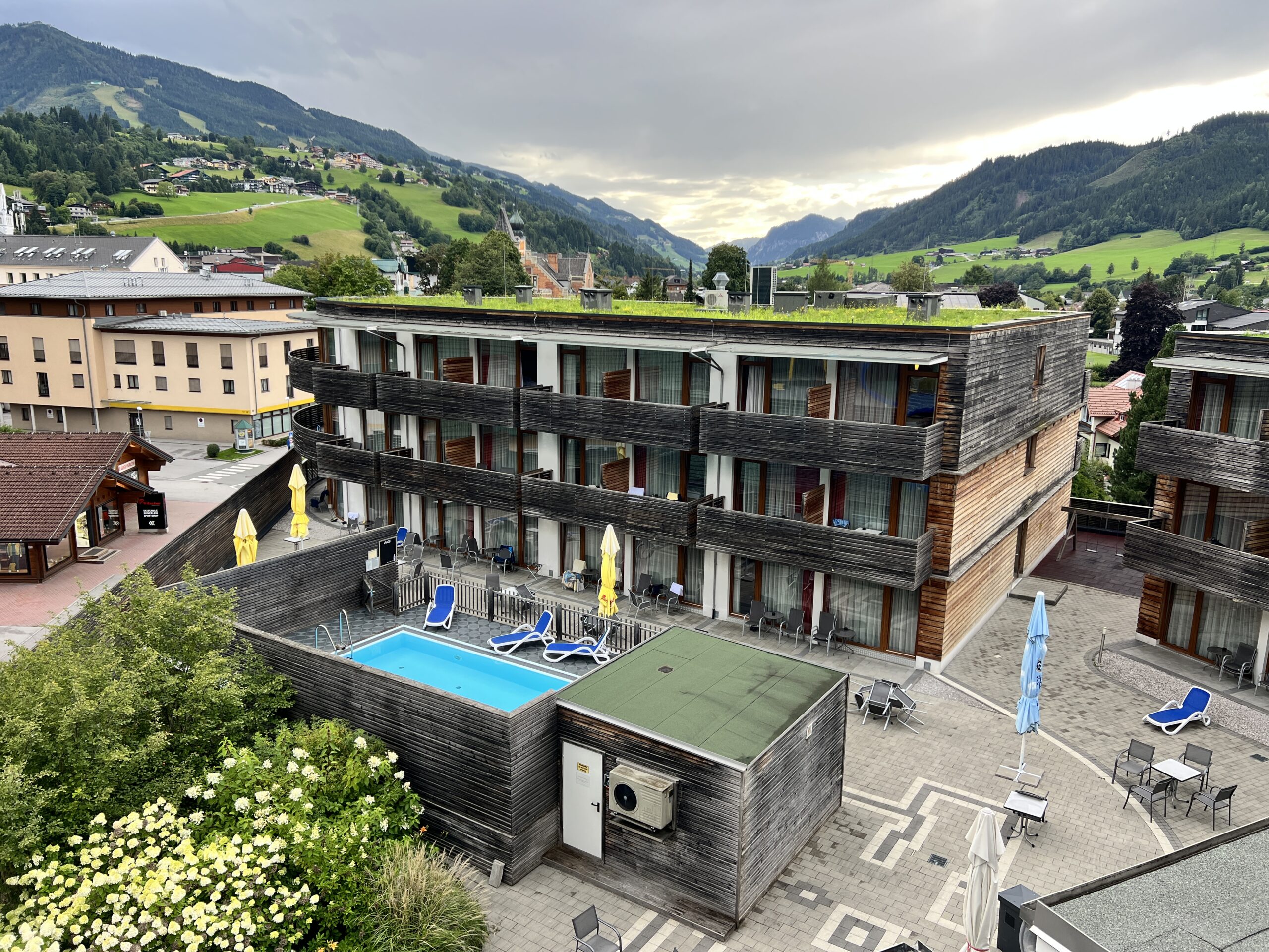 Hotellet byder desuden på en hyggelig bar, wellness-område, og en tagterrasse med panoramaudsigt over bjergene – det perfekte sted for vores morgenyoga-sessioner.